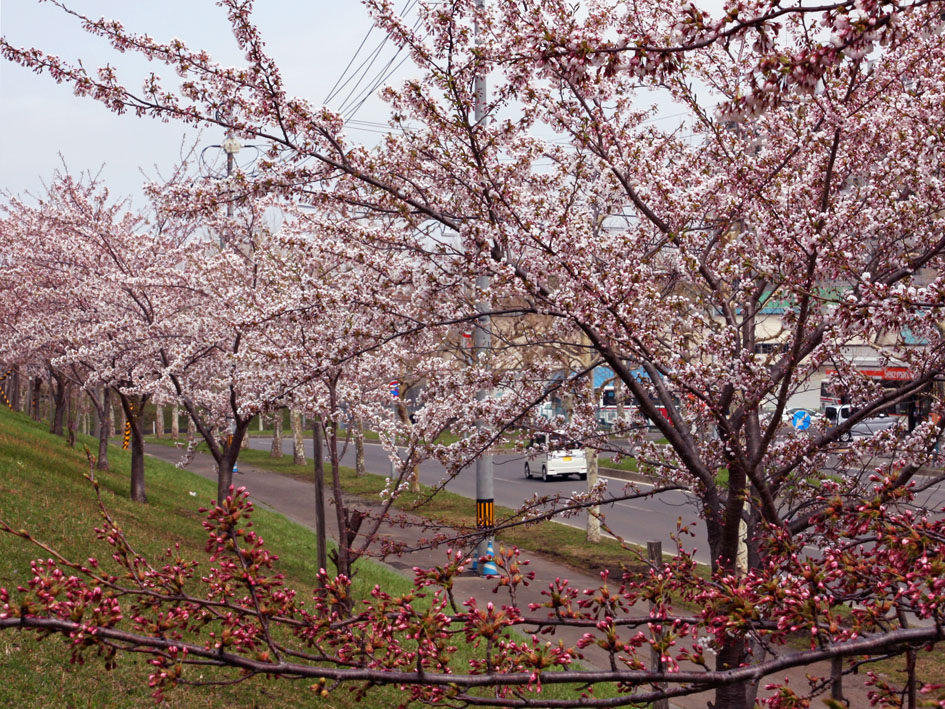大志さくら会が2009年5月、JR北広島駅東口に植えたソメイヨシノ12本(うち1本は病で伐採)は、4月28日に開花しゴールデンウイーク半ばごろに満開となりました(写真上)。植樹から13年目の苗木は、直径20センチ以上にも成長。東口駐輪場の1階平屋屋根をはるかに超え、大きく張った枝一面の花びらは凛として青空を覆い隠すほど。札幌と結ぶエルフィンロードの始終着点だけに、サイクリストやウォーカーらの新たな名所になることが期待されます。写真下は2013年に植えた駅西口・UR北進団地遮断緑地(北広島市消防署向い)のソメイヨシノ。こちらもきれいに咲きそろいました。