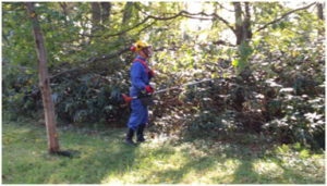 大志さくら会は、JR北広島駅~中の沢・ふれあい公園の約3㌔を、新名所「さんぽまち・さくらロード」に―と、ソメイヨシノの植栽に務めています。その中間地の松葉町のトリムコースで、10月14日と15日に役員ら10人が、両側から迫るササ竹刈りを実施しました。作業は動力草刈り機2台にササ竹専用の歯を取り付け、成長したサクラを取りまく屈強な竹を根元から除去しました。(写真下)5年間に及んだ作業で、緑葉公園プールから「サポートセンターともに」間のササ竹を、両側の林まで後退させることができました。大志さくら会は数年後、「ともに」を主会場に念願の「さくらまつり」を開けないかと検討中です。作業に参加した仲間たちは、「早く立派な花を、たくさん咲かせておくれ」と、願いを込めました。