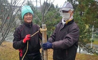 「大志さくら会」は、降雪期が迫った11月28日、2009年からJR北広島駅-ら中の沢・ふれあい公園間の約3㌔の市有地に植えたソメイヨシノの枝木の冬囲い作業に着手。対象のさくらは、全470本のうち植樹からまだ日が浅く、荒縄で固定が可能な木々です。役員5人が手分けして回り、2日間で約80本の枝を縄で縛りました。「これで冬の間の強風、雪の重さにも耐えられるはず」と、参加者たちは2022年最後の作業を無事終えましえた。