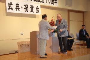 「きたひろしま大志さくら会」の設立10周年を祝い、市芸術文化ホールに、来賓、花咲か市民、会員の計48人が集いました。 長瀬千年会長が、「10年間で407本を植樹。豊かなさくらの杜をめざして20周年へと進みたい」とあいさつ。植樹活動などに多大な助力をいただいた中道リース㈱、金川牧場㈲、星槎道都大学野球部の代表者に、それぞれ感謝状が贈られました。 引き続き同じ会場で祝賀会を開催。金川弘司・大志さくら会顧問の乾杯音頭の後、実行委員会メンバーが制作したDVD「10年の歩み」を鑑賞、来賓や花咲か市民の心温まるスピーチに耳を傾けるなど、杯を重ねながら楽しい時を過ごしました。